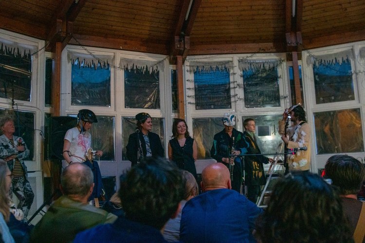 [ID: of a group of people sat on a stage facing an audience. They are all performing. The person on the far left is crossing their arms. The next person is wearing a cycling helmet and looking down. The next two performers are smiling with their hands behind their backs. The next person is holding their instrument and wearing a colourful hat and jacket, they match with the person next to them who isn’t wearing a hat but is wearing a similar style jacket. The last performer on the far right is facing the performers, not the audience. They are wearing a beige jacket and touching their hat. We see the back of the heads of seven audience members.]