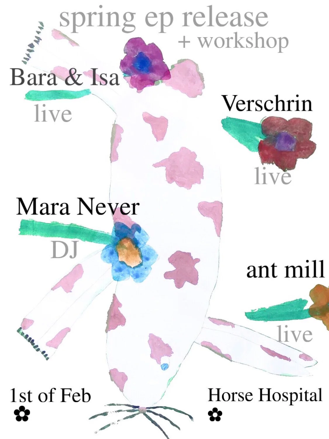 Bara & Isa + friends warmly invite you to an evening of sound in celebration of the release of Bara & Isa’s new spring ep, coming out on Warm Winters Ltd. on the same day, 1st of February 26. The evening will start off at 5:00pm with a vocal workshop in collaboration with Noa from the Voicing Project and progress with a presentation of spring ep (extended version) as well as live sets by Verschrin and ant mill and a DJ set by Mara Never.