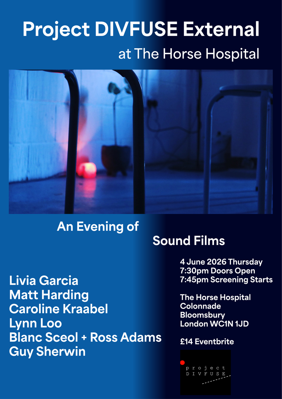 Project DIVFUSE is presenting its second off-site event and a first one at The Horse Hospital. Bringing together several artists who have exhibited or performed at DIVFUSE micro project space in Lower Clapton E5 since its doors first opened to the public in July 2021, this evening will showcase sound inspired films. It is also one of the events to celebrate the 5th anniversary of Project DIVFUSE.