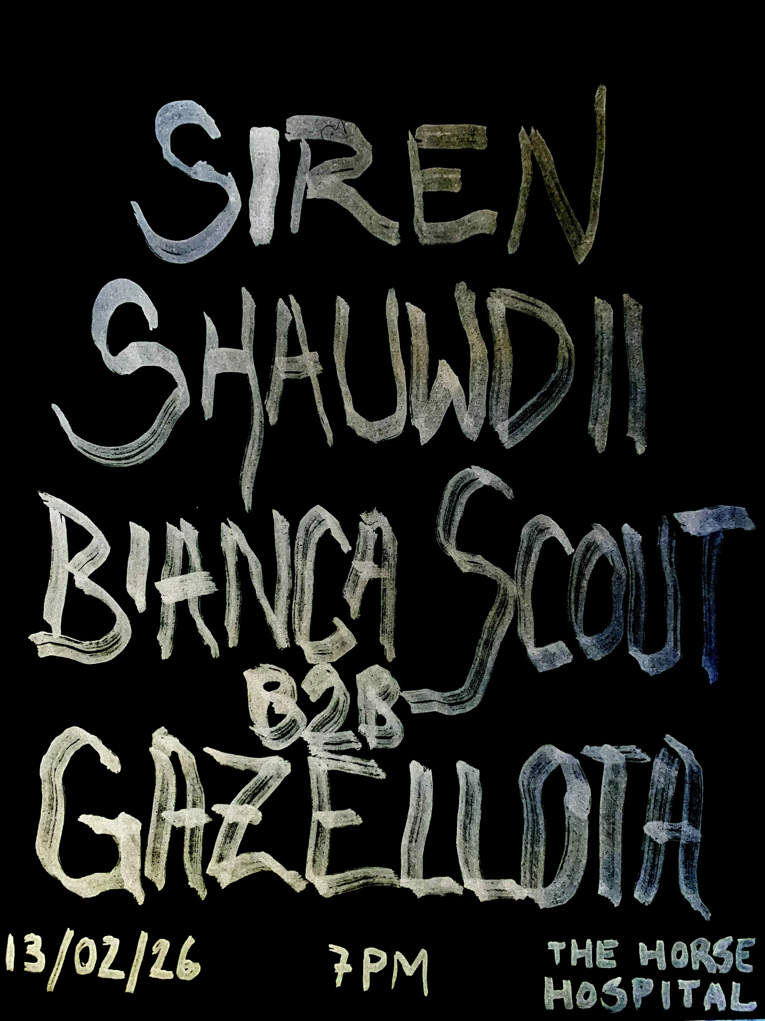 An evening of dark ambient and looped soundcapes with an extended set by Bianca Scout B2B Gazellota, the live sonic world of Siren and a hybrid set by Shauwdii