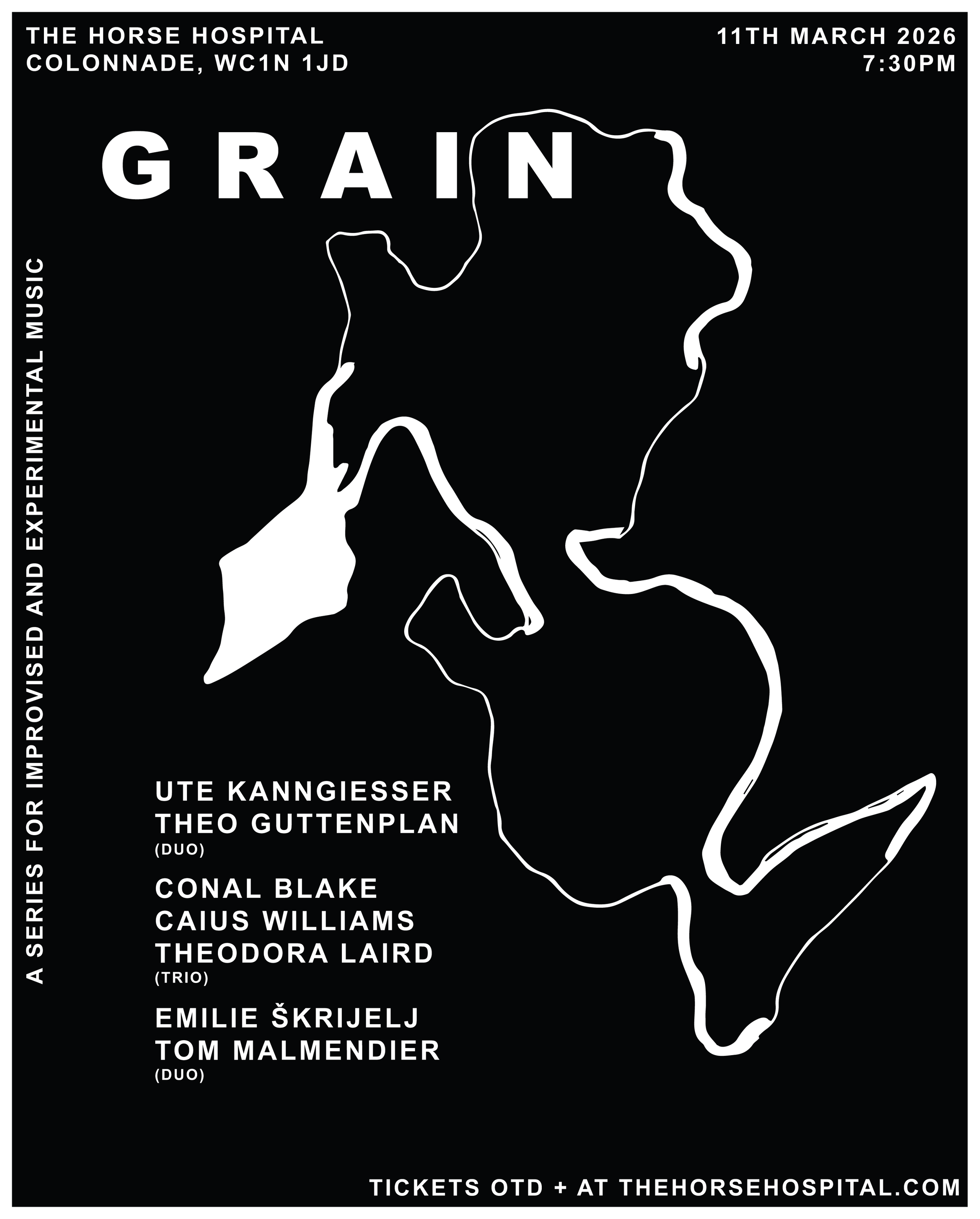 GRAIN is an ongoing series of improvised and experimental music. With live performance from: Ute Kanngiesser & Theo Guttenplan (duo), Theodora Laird, Conal Blake, Caius Williams (trio), Emilie Škrijelj & Tom Malmendier (duo)