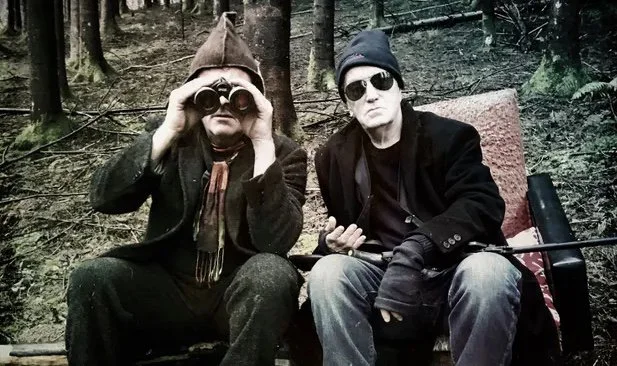 [ID: two people are sat in a forest. One is sat on an old armchair: they are wearing a beanie hat and sunglasses, a black suit jacket and jeans. The one of the left is wearing a pointed brown hood and looking through binoculars. Both are staring back at the viewer]