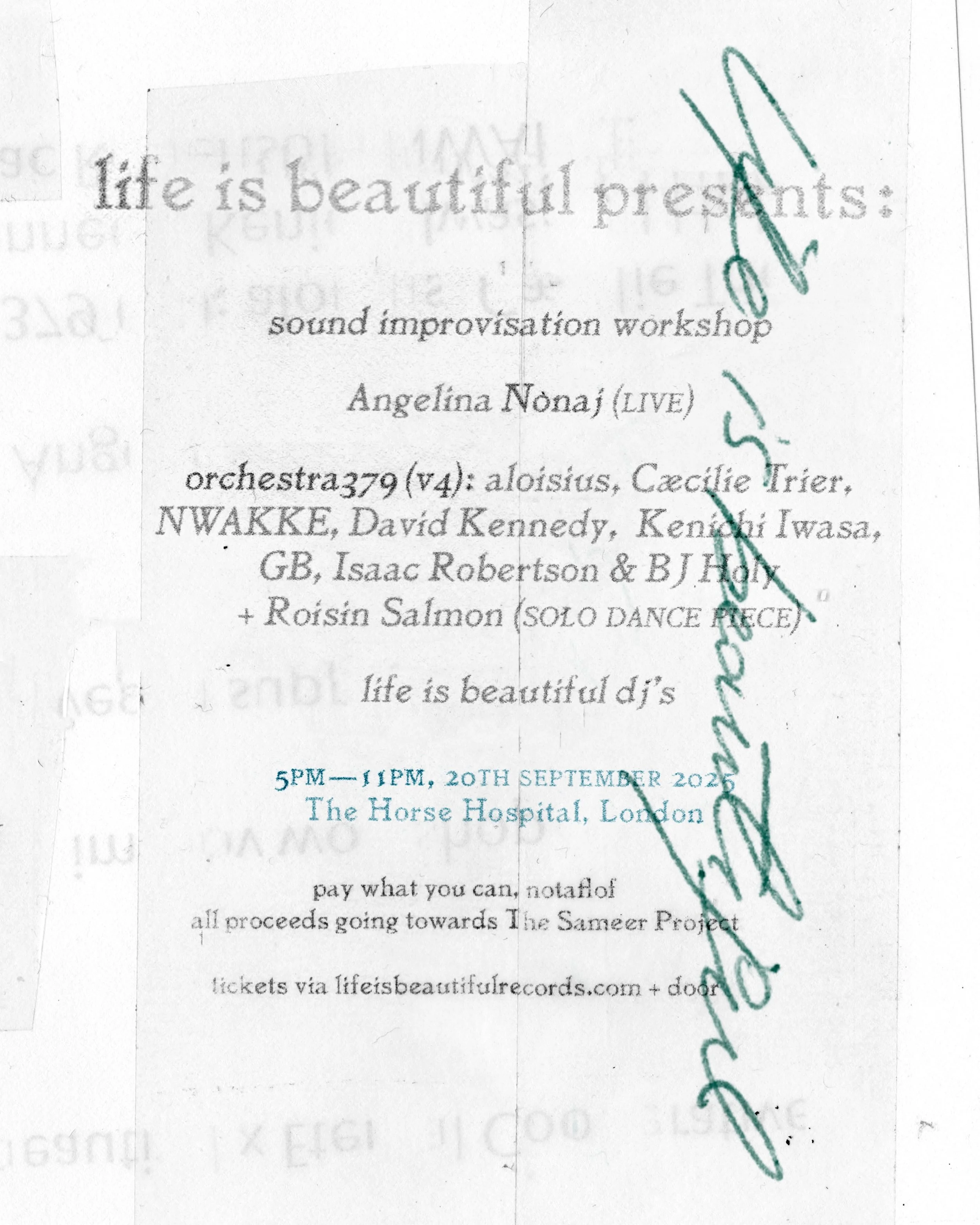 as well as an improvised performance by the fourth iteration of orchestra379, featuring Cæcilie Trier (aka CTM), GB, David Kennedy (of still house plants), Kenichi Iwasa, Isaac Robertson, NWAKKE, BJ Holy & aloisius + dance by Roisin Salmon.