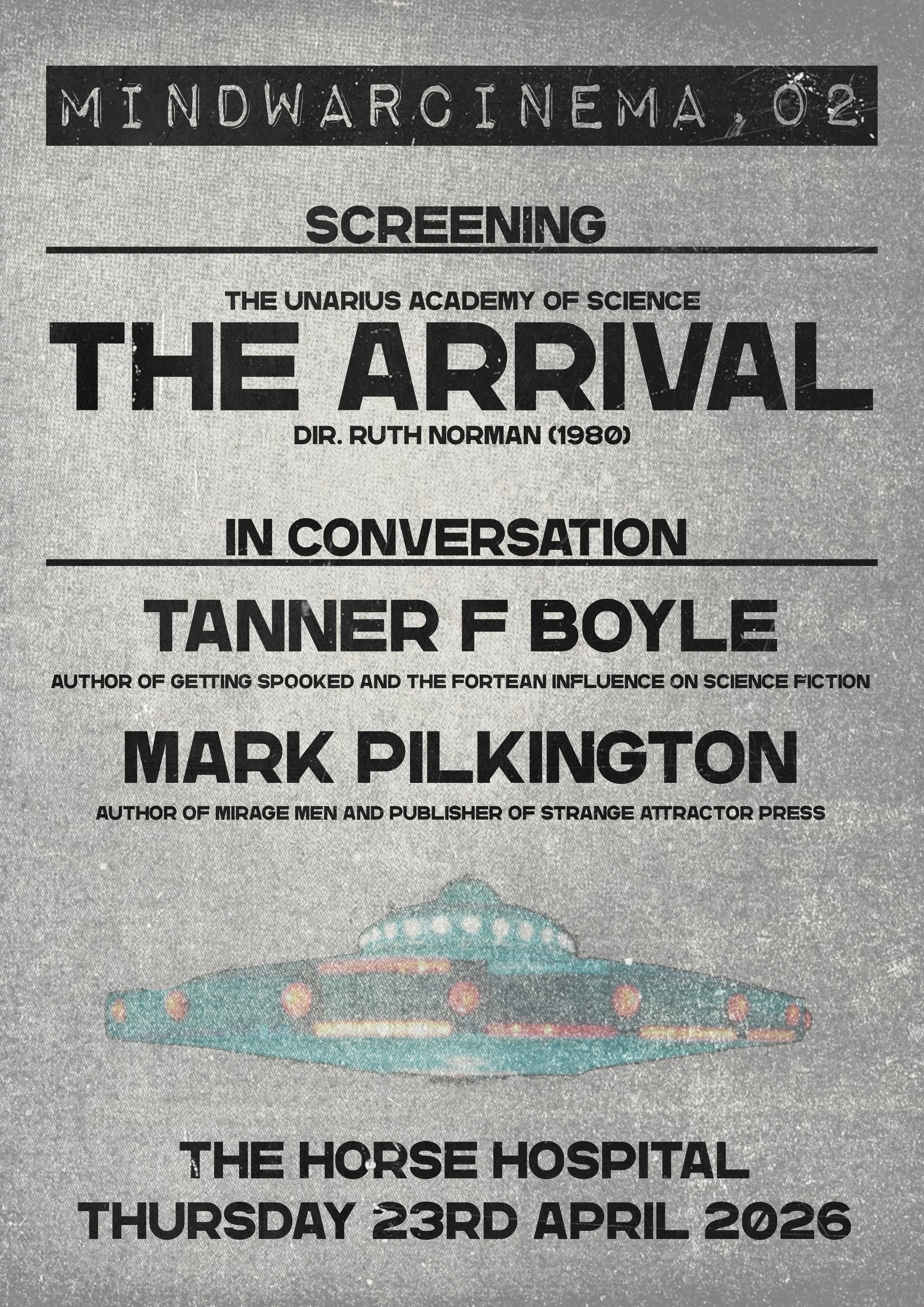 Mindwarcinema present a screening of the cult classic The Arrival (1980), directed by Ruth Norman of The Unarius Academy of Science. The screening will be accompanied by an in conversation between Tanner F Boyle, author of Getting Spooked and The Fortean Influence on Science Fiction) and Mark Pilkington (author of Mirage Men and publisher of Stranger Attractor Press).