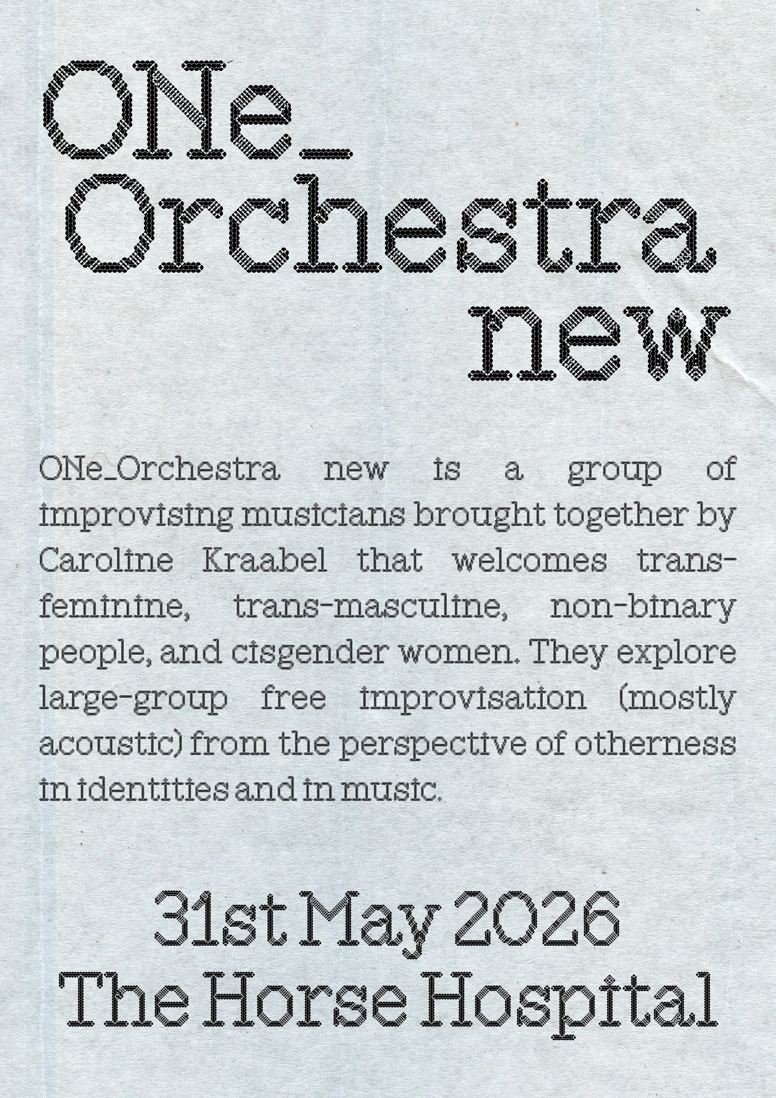 ONe_Orchestra new is a group of improvising musicians brought together by Caroline Kraabel that welcomes trans-feminine, trans-masculine, and non-binary people, and cisgender women. They explore large-group free improvisation (mostly acoustic) from the perspective of otherness in identities and in music.